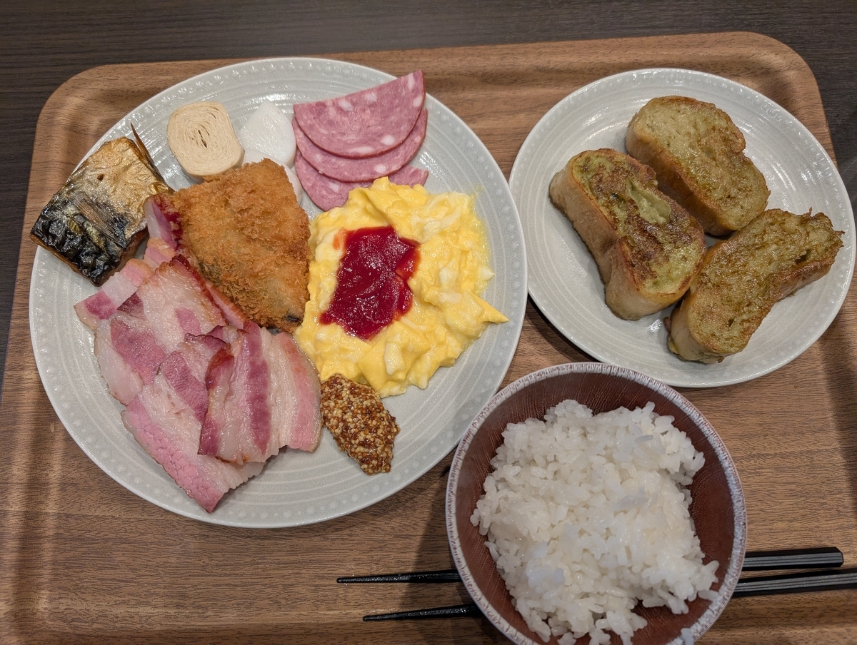 朝食も種類が豊富で魚介をご飯に乗せる「勝手丼」、フレンチトーストなど盛り沢山。
