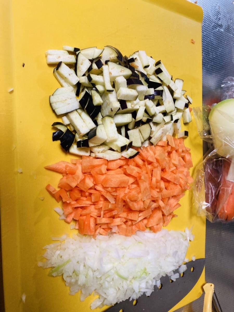 ・玉ねぎ・人参・ナスをみじん切りにします。